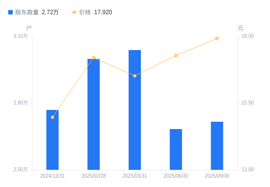 10月24日消息,数据显示,截至2025年9月30日,A股股东总户数为2.72万户,较上期(2025年6月30日)增加331户,增幅1.23%。公司最新A股总股本为7.03亿股,其中流通A股7.03亿股,户均持有流通A股数量为2.59万股,较上期减少319.27股,降幅1.22%;户均持流通A股市值46.38万元,较上期增加1.1万元,增幅2.44%。