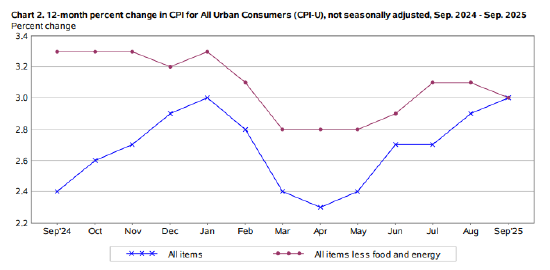 美国9月未季调CPI年率录得3%,为2025年1月以来新高,增幅略低于市场普遍预期的3.1%。