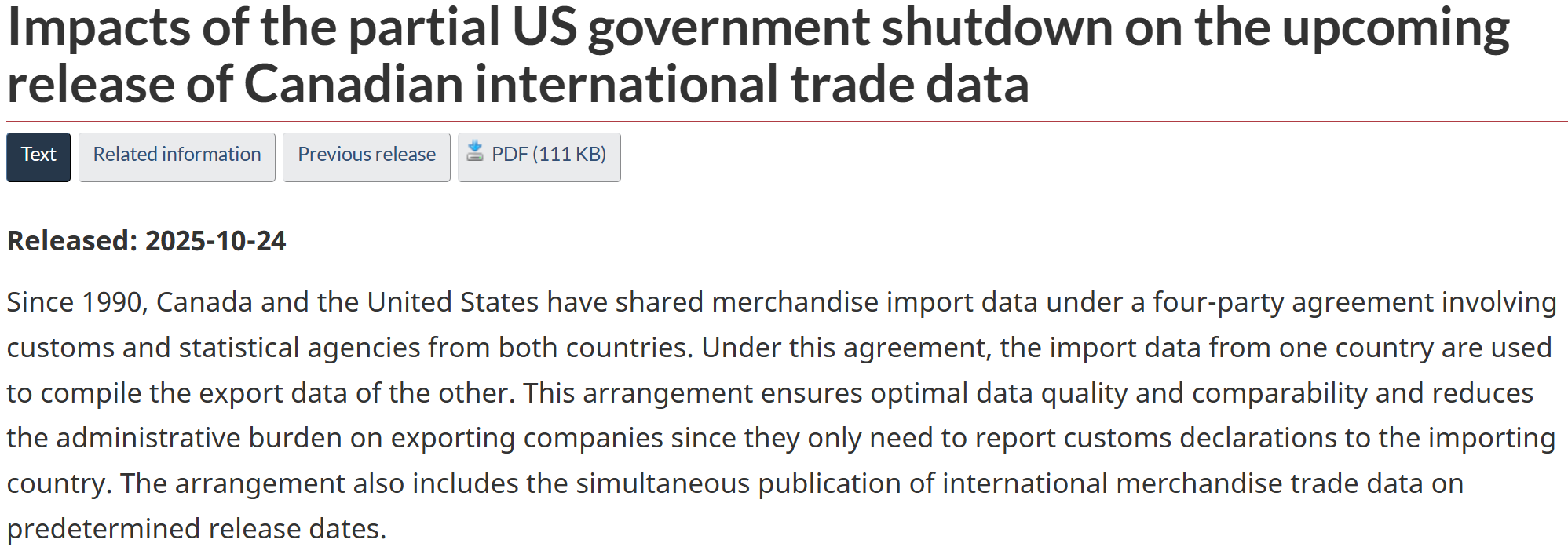 回到最初的贸易数据问题,加拿大统计局表示,目前先暂时停发加拿大的月度贸易数据,但如果美国政府停摆的时间持续延长,届时可能会考虑其他选项