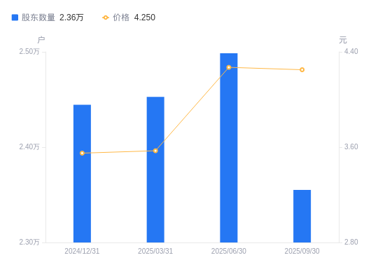10月24日消息,数据显示,截至2025年9月30日,A股股东总户数为2.36万户,较上期(2025年6月30日)减少1434户,降幅5.74%。公司最新A股总股本为12.26亿股,其中流通A股12.08亿股,户均持有流通A股数量为5.13万股,较上期增加2942.49股,增幅6.09%;户均持流通A股市值21.79万元,较上期增加1.15万元,增幅5.59%。