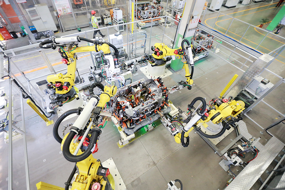 2024年10月18日,江苏扬州,在位于江都高新技术产业开发区一家汽车生产企业的智能化焊装车间,工业进行焊接作业。 资料图