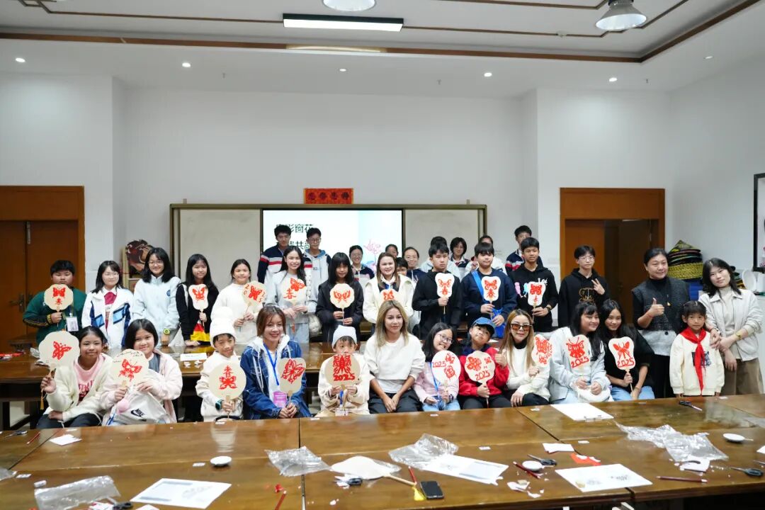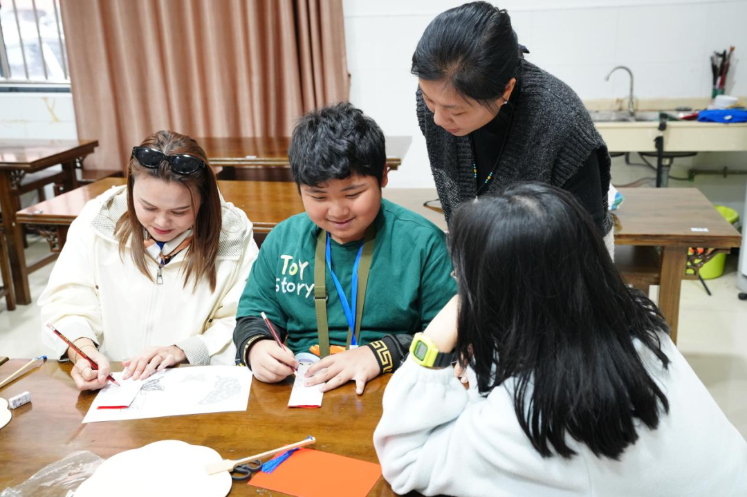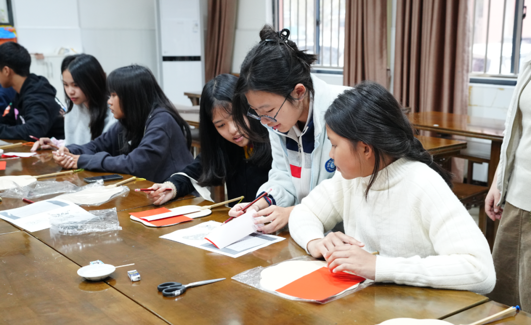 随后在美术教室,赵翠艳老师引领泰国师生沉浸于中国传统的剪纸艺术之中。赵翠艳老师首先娓娓道来我国底蕴深厚的剪纸文化,泰国师生听得全神贯注。随后,泰国师生拿起画笔,在红纸背面临摹出蝴蝶、鲜花等图案,附中的志愿者们则在一旁耐心细致地指导。当一幅幅精美的剪纸作品贴在洁白的扇面上,文化的种子也在彼此心田中悄然萌芽。