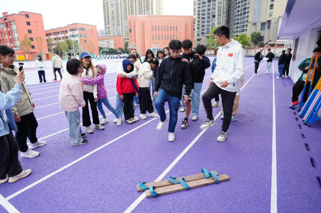 16时20分,在黄婉容老师的组织下,泰国师生来到田径场,亲身体验板鞋、高跷等广西民族传统体育项目。欢声笑语中,中泰师生携手合作,默契配合,在运动中深化了解,在欢笑中增进情谊。