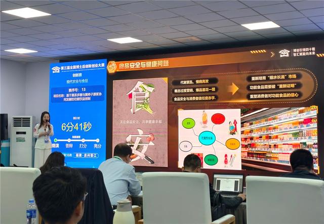 开赛当天,内蒙古博士后团队依次进入比赛。在创新赛区,中国农业科学院草原研究所博士后余鳗游路演“基于黑茶多糖与黄柿子原浆协同发酵的功能饮品创制”项目。