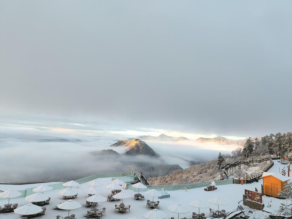 “虽然相较去年稍晚一点,但阳光下的雪景更显惊艳。从现在到12月中旬,随着气温持续下降,将开启‘降雪模式’,这种‘开盲盒’式的降雪,将不定时给游客带来惊喜。”景区日月坪区域工作人员介绍,若降雪持续,积雪厚度有望达到5厘米—8厘米。