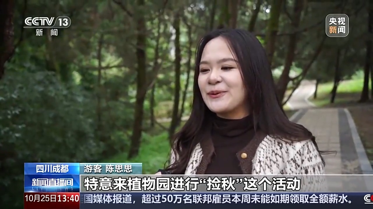 成都市植物园林业工程师 谭琲琳:大家去“捡秋”的时候一定要注意三个原则,第一就是千万不要去采摘,不要破坏,我们去捡拾自然掉落在地上的部分就可以了,第二个原则就是不要食用,我们去观赏去看就可以了,尤其是完全不认识的那些植物,第三个原则就是希望大家更多地去注重捡拾的多样,而不是过量,不要去针对某一种植物过量地去捡拾。