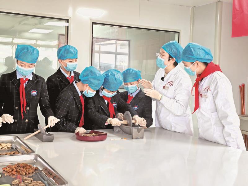 “这片叶子叫薄荷,感冒了泡水喝可以通鼻子;那个红红的果子是枸杞,对眼睛有好处……”在中药辨识室,平时只在课本上见过的中草药,此刻就在眼前。当听到平时爱吃的山楂、厨房里用的生姜、煲汤放的桂圆都是中药时,孩子们发出了阵阵惊叹。此外,孩子们还参观了中药房,认识了戥秤、药臼等传统工具,观看了“百子柜”抓药的娴熟过程,对医生们“一抓准”的技艺佩服不已。