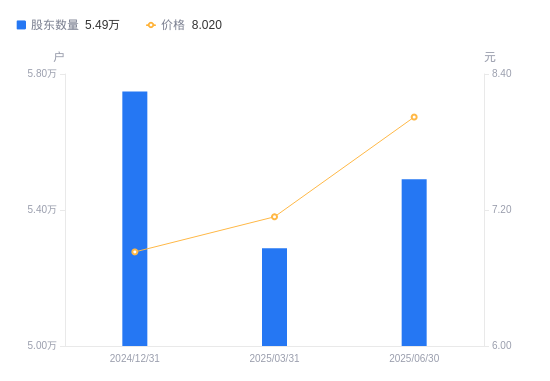 10月27日消息,数据显示,截至2025年9月30日,A股股东总户数为4.9万户,较上期(2025年6月30日)减少5873户,降幅10.70%。公司最新A股总股本为11.12亿股,其中流通A股11.12亿股,户均持有流通A股数量为2.27万股,较上期增加2268.24股,增幅11.12%;户均持流通A股市值21.86万元,较上期增加5.49万元,增幅33.56%。
