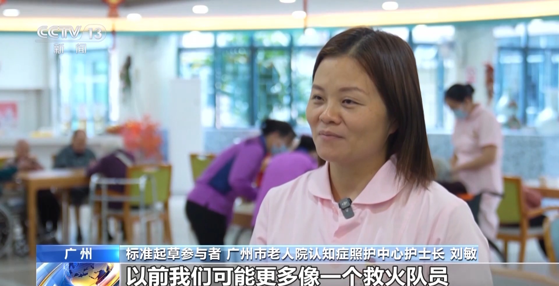 标准起草参与者 广州市老人院认知症照护中心护士长 刘敏:以前我们可能更像一个救火队员,比如说老人迷路,不肯吃饭,我们就赶快过去处理。现在我们可能更像他一个资深的朋友,或者是他的家人,提前来了解他的需求,评估他出现这些问题的原因。