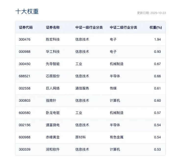 中证500指数10大权重股,多为信息技术、通信服务等行业的股票,且前10大成份股合计权重仅为7.59%,成份股的分散程度相对更高: