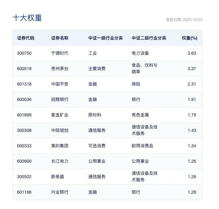 中证A500指数前10大权重股,不仅行业分布更加广泛,且几乎都是我们熟悉的行业巨头,前10大成份股合计权重接近20%: