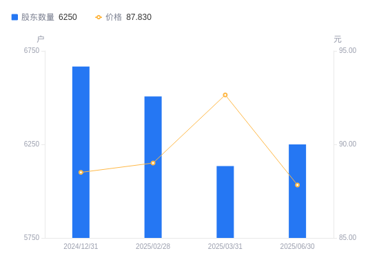 10月29日消息,数据显示,截至2025年9月30日,A股股东总户数为8574户,较上期(2025年6月30日)增加2324户,增幅37.18%。公司最新A股总股本为8804.87万股,其中流通A股8804.87万股,户均持有流通A股数量为1.03万股,较上期减少3818.52股,降幅27.11%;户均持流通A股市值118.95万元,较上期减少4.78万元,降幅3.87%。