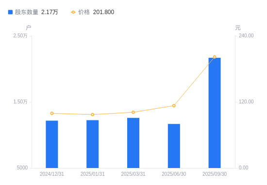 10月29日消息,数据显示,截至2025年9月30日,A股股东总户数为2.17万户,较上期(2025年6月30日)增加1万户,增幅85.89%。公司最新A股总股本为4.8亿股,其中流通A股4.36亿股,户均持有流通A股数量为2.01万股,较上期减少1.73万股,降幅46.20%;户均持流通A股市值405.58万元,较上期减少17.67万元,降幅4.17%。