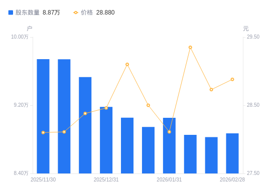 3月4日消息,数据显示,截至2026年2月13日,A股股东总户数为8.83万户,较上期(2026年2月10日)减少271户,降幅0.31%。公司最新A股总股本为16.64亿股,其中流通A股16.63亿股,户均持有流通A股数量为1.88万股,较上期增加57.67股,增幅0.31%;户均持流通A股市值54.12万元,较上期减少9987.33元,降幅1.81%。