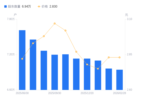 3月4日消息,数据显示,截至2026年2月28日,A股股东总户数为6.94万户,较上期(2026年1月31日)减少201户,降幅0.29%。公司最新A股总股本为29.89亿股,其中流通A股29.89亿股,户均持有流通A股数量为4.3万股,较上期增加124.28股,增幅0.29%;户均持流通A股市值12.18万元,较上期增加351.7元,增幅0.29%。