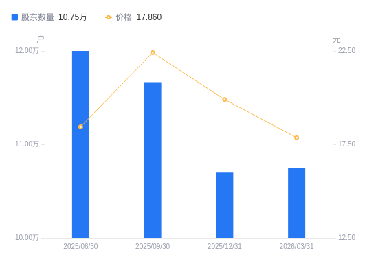 4月14日消息,数据显示,截至2026年3月31日,A股股东总户数为10.75万户,较上期(2025年12月31日)增加448户,增幅0.42%。公司最新A股总股本为8.74亿股,其中流通A股8.73亿股,户均持有流通A股数量为8121.66股,较上期减少33.99股,降幅0.42%;户均持流通A股市值14.51万元,较上期减少1.72万元,降幅10.63%。