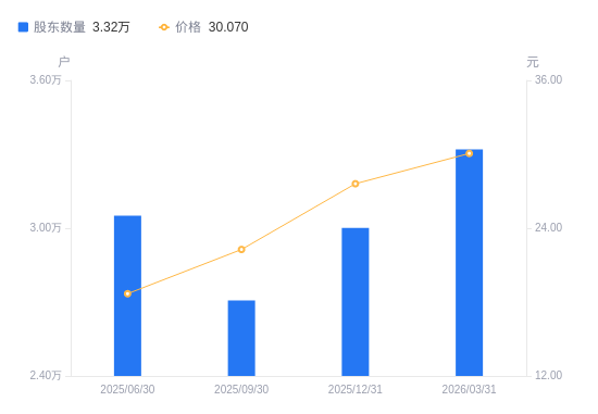 4月14日消息,数据显示,截至2026年3月31日,A股股东总户数为3.32万户,较上期(2025年12月31日)增加3193户,增幅10.64%。公司最新A股总股本为22.42亿股,其中流通A股22.42亿股,户均持有流通A股数量为6.75万股,较上期减少7182.59股,降幅9.62%;户均持流通A股市值203万元,较上期减少3.22万元,降幅1.56%。