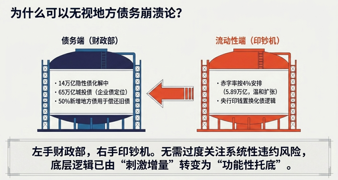 目前重点化解的是已排查出的 14 万亿地方隐性债务,而约 65 万亿城投债仍被界定为企业债务。尽管地方层面偿债压力依然较大,但整体风险可控,无需过度恐慌。其实中美日等大国逻辑相通:左手财政、右手货币,政府不会让自身信用体系出现系统性破产。