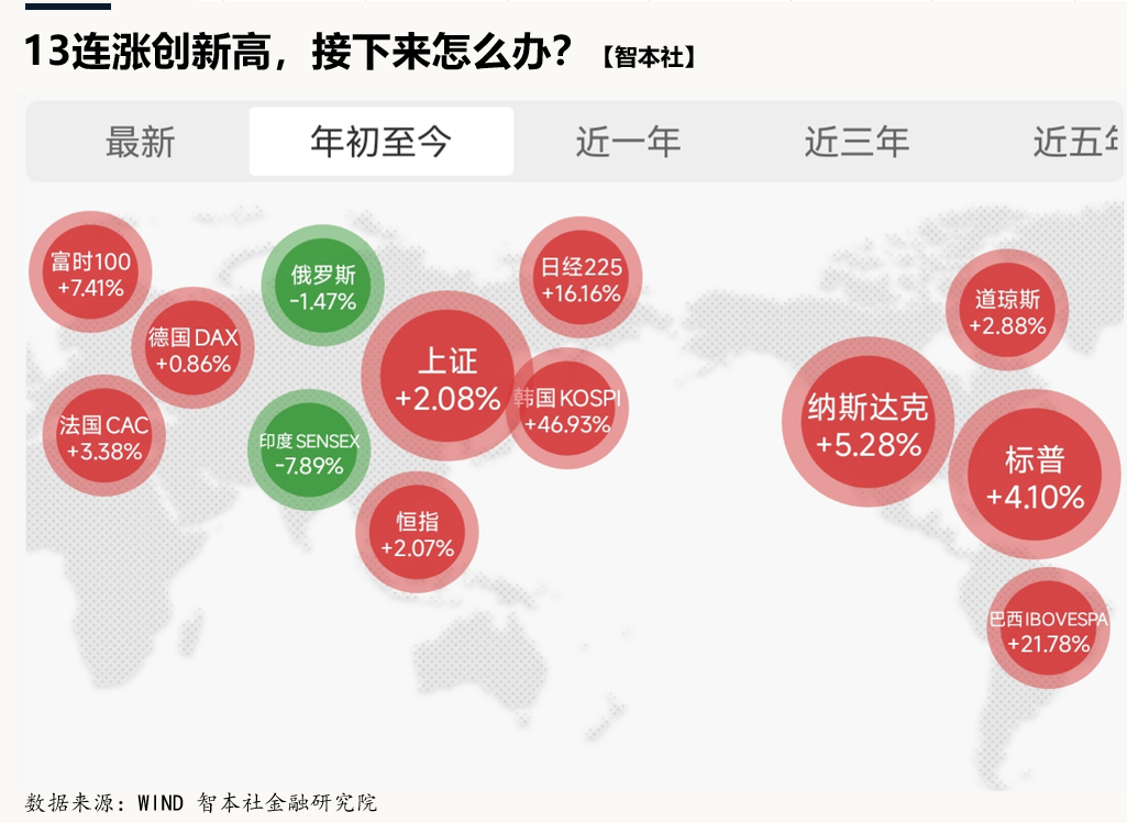 在近期的多重消息之下,标普 500 与纳指不仅收复本轮全部跌幅,更是再创历史新高。A 股重回 4000 点,港股站稳 26000 点。截至本周收盘,标普 500 报 7126点刷新纪录,纳指24468点,实现连续 13个交易日上涨,创下自1992年1月以来最长连涨纪录。