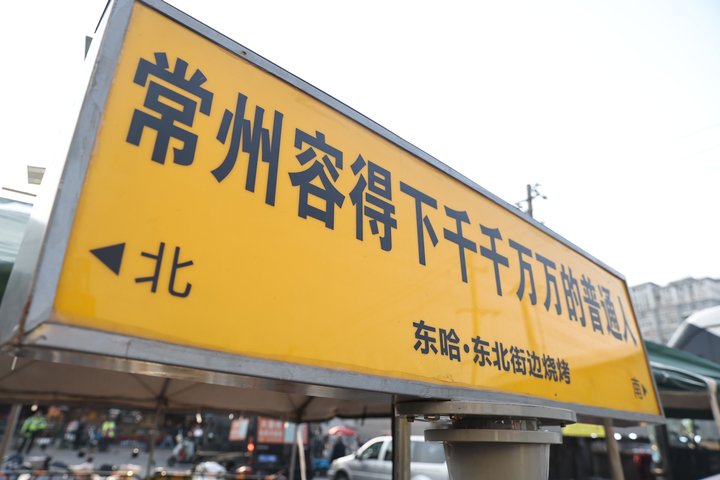 顾客的喜爱让小摊迅速有了火爆的迹象,2023年10月刚摆摊的夫妻俩在12月就转向店面经营。去年夏天,这家不起眼的小店因为一块广告牌迅速走红。2025年6月21日,“苏超”第五轮常州对战南京的比赛在雨中进行。场边,一块只光秃秃印着“东哈·东北街边烧烤”几个大字的黄色广告牌与京东、等知名企业并列,引发网友的广泛热议。