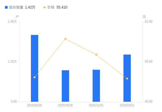4月26日消息,数据显示,截至2026年3月31日,A股股东总户数为1.42万户,较上期(2025年12月31日)增加4553户,增幅47.41%。公司最新A股总股本为9253.53万股,其中流通A股6536.66万股,户均持有流通A股数量为4617.26股,较上期减少2188.92股,降幅32.16%;户均持流通A股市值25.58万元,较上期减少19.46万元,降幅43.20%。