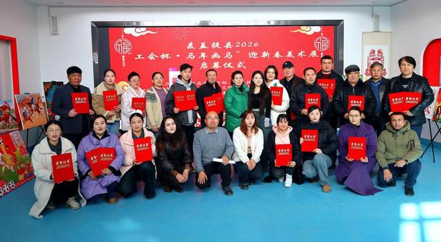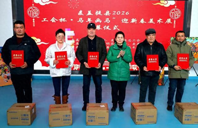2月13日,麦盖提县2026“工会杯·马年画马”迎新春美术展在该县新时代文明实践中心开展。数十名农民画家、美术爱好者和干部群众参加启幕仪式。