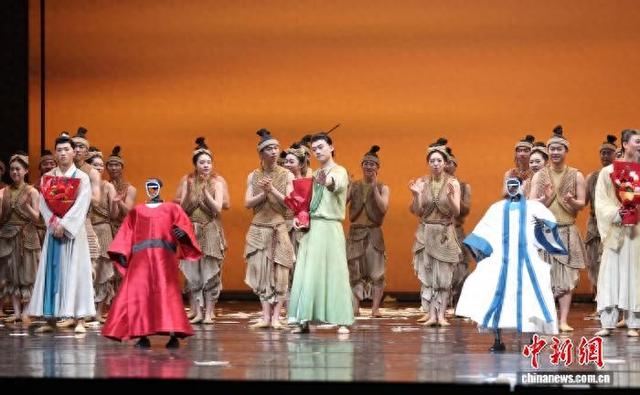 2月14日晚,江西南昌,舞剧《天工开物》谢幕时,两个穿着定制演出服的人形在舞台上狂飙“舞”功,引得现场观众欢呼声和掌声不断。当晚的演出是舞剧《天工开物》马年新春来临前的最后一场巡演,该剧融合东西方舞蹈、音乐和舞美元素,主要讲述中国明代江西籍科学家宋应星六次科举落榜后潜心著书的故事。中新社记者 刘占昆 摄
