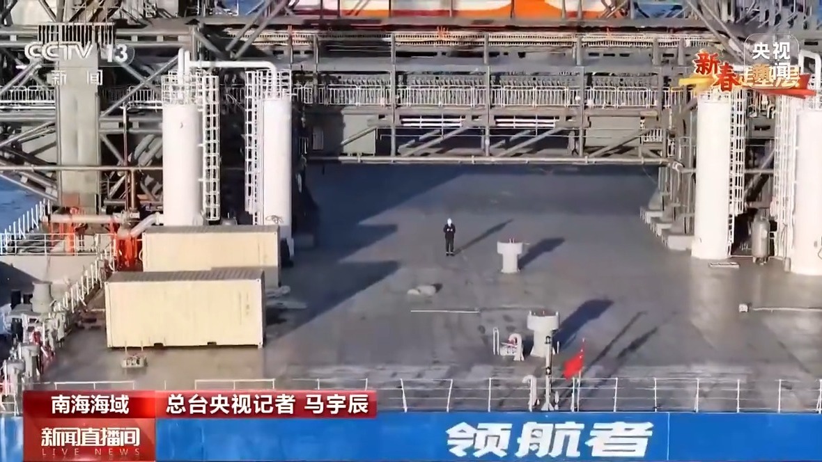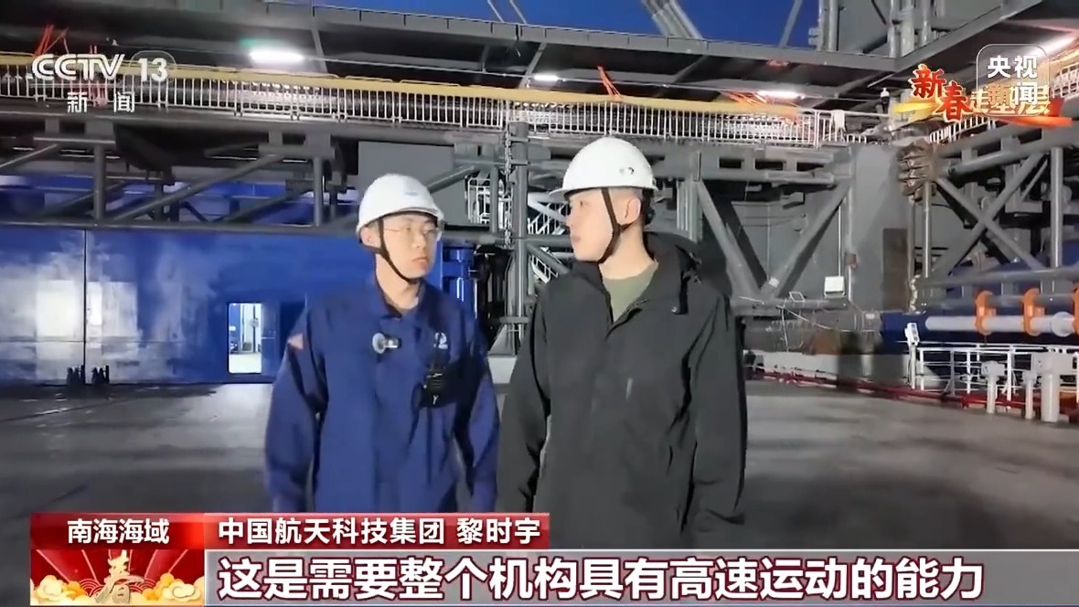 总台记者 马宇辰:“领航者”号海上回收平台长144米,宽50米,满载排水量超过2.5万吨,是个名副其实的大家伙。但是发射塔架的高度接近70米,加上船体和天线,整体的高度接近30层楼高,所以它的重心是非常高的,再加上冬天的海况比较恶劣,我的感觉就是整个船体都在不规律地摇晃着。
