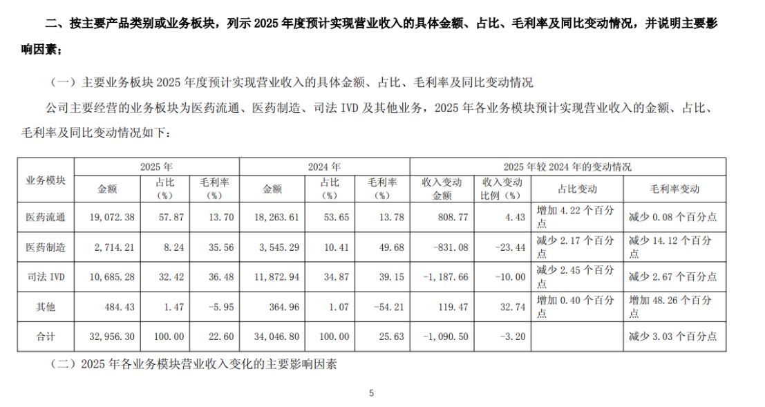 根据国发股份的回复公告,公司三大核心业务板块在2025年度呈现“冰火两重天”。其中司法IVD业务和医药制造业务成为拖累整体业绩的主要因素。