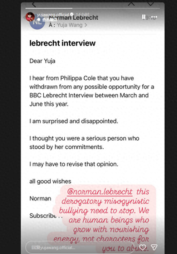 截图显示了著名英国乐评人莱布雷希特发给王羽佳的一封邮件,“我从Philippa Cole那里得知,你已退出今年 3 月至 6 月期间接受‘BBC 莱布雷希特采访’(莱布雷希特在BBC的一档节目)的一切可能安排。我对此感到意外且失望。我原以为你是一位信守承诺、态度认真的人。我恐怕要重新评估这一看法了。”