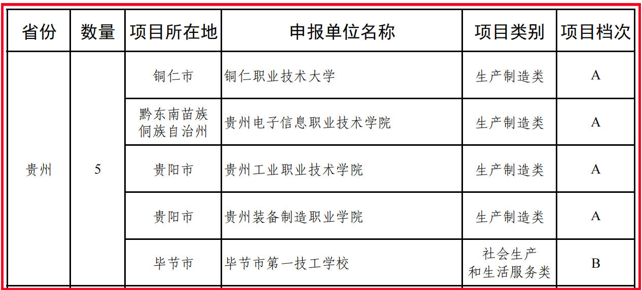 其中,铜仁职业技术大学、贵州电子信息职业技术学院、贵州工业职业技术学院、贵州装备制造职业学院和毕节市第一技工学校5所院校入选国家级高技能人才培训基地。