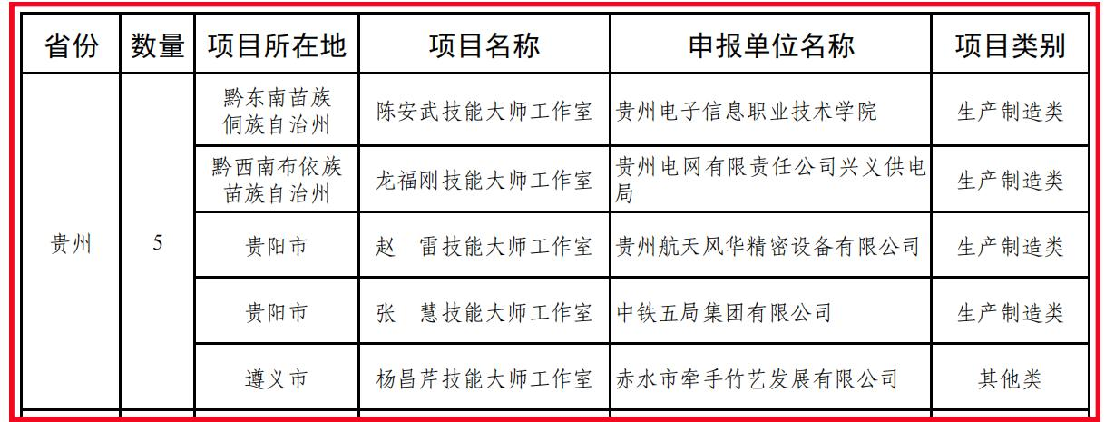 陈安武技能大师工作室、龙福刚技能大师工作室、赵雷技能大师工作室、张慧技能大师工作室和杨昌芹技能大师工作室5个工作室入选国家级技能大师工作室。