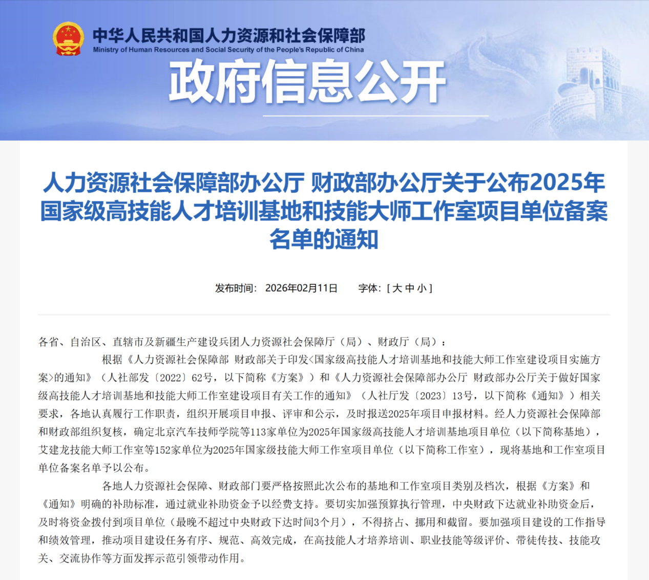 人社部近日公布2025年国家级高技能人才培训基地和技能大师工作室项目单位备案名单。